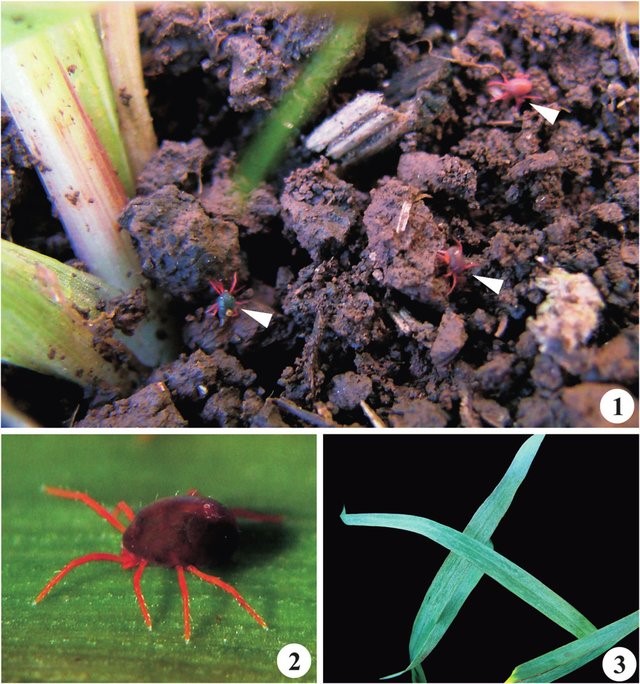 Рис. 1. Клещ Penthaleus major. 1 - клещи на поверхности почвы — стрелки,  2 - питание взрослых, 3 - симптомы на листьях овса (https://www.researchgate.net/publication/313737184_First_Record_of_Penthaleus_major_Acari_Penthaleidae_in_Brazil/figures?lo=1)